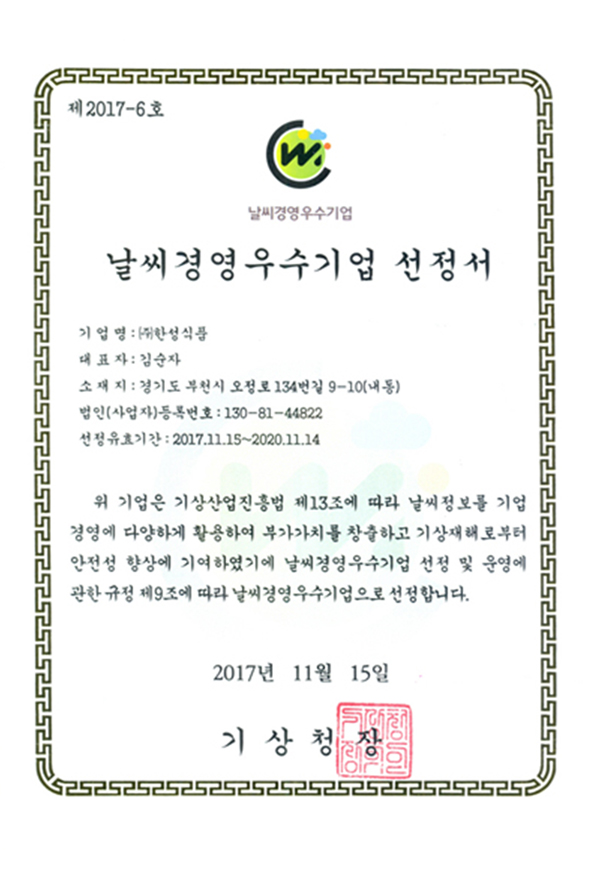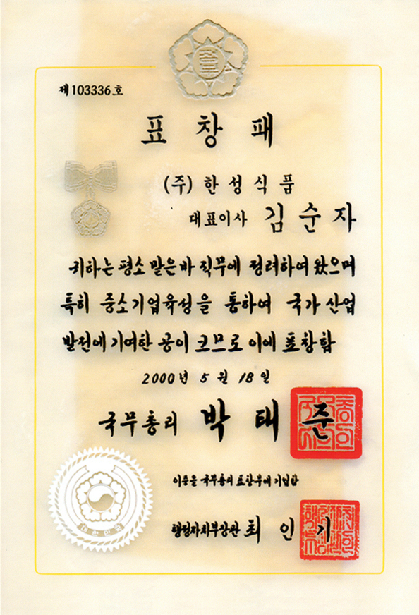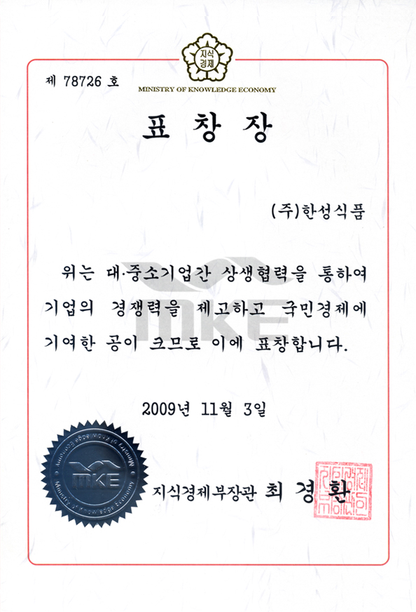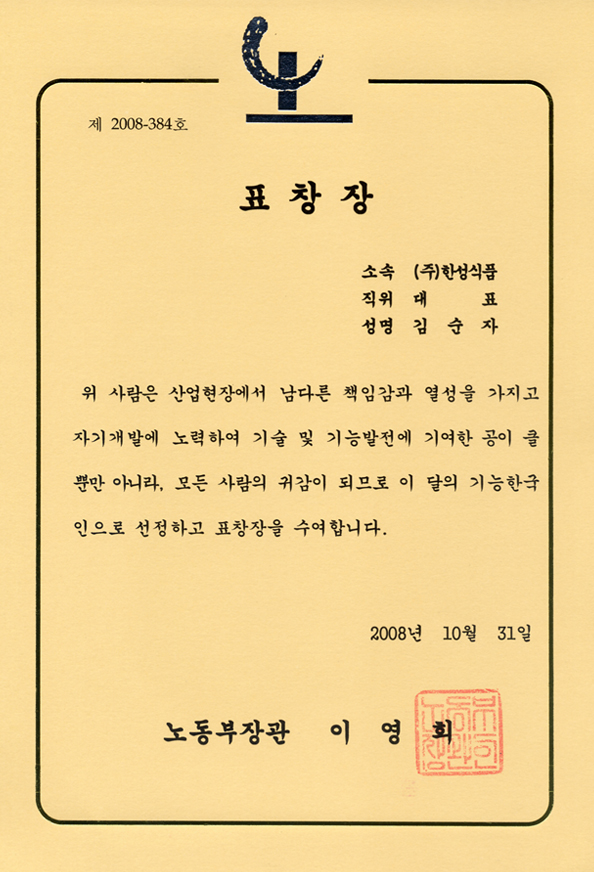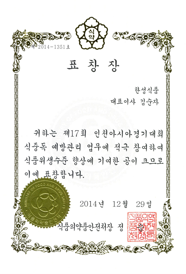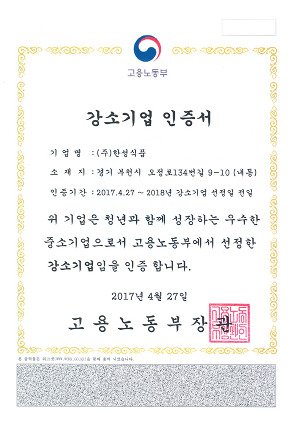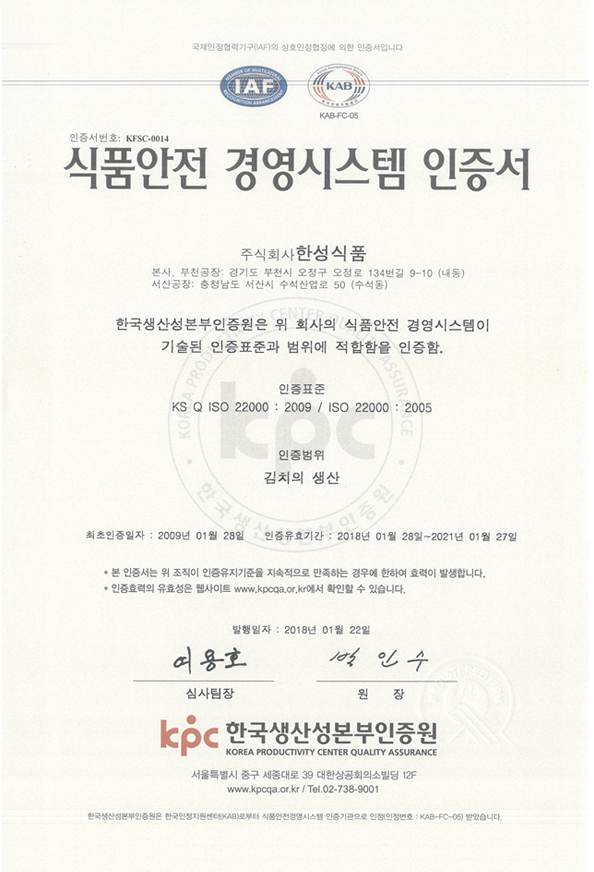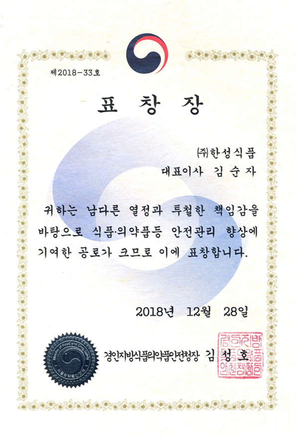 한성식품은 끊임없이 노력하고 연구하고 있습니다. HACCP과 ISO 22000, 할랄 인증 등 각종 품질 인증과 시상내역들을 소개합니다.