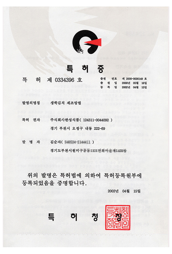 | 8 | 2002. 10. 22 | 0359471 | 얼열김치 제조방법 |