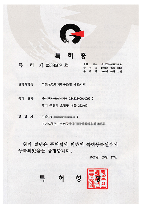 | 4 | 2002. 05. 17 | 0338569 | 키토산간장게장통조림 제조방법 |