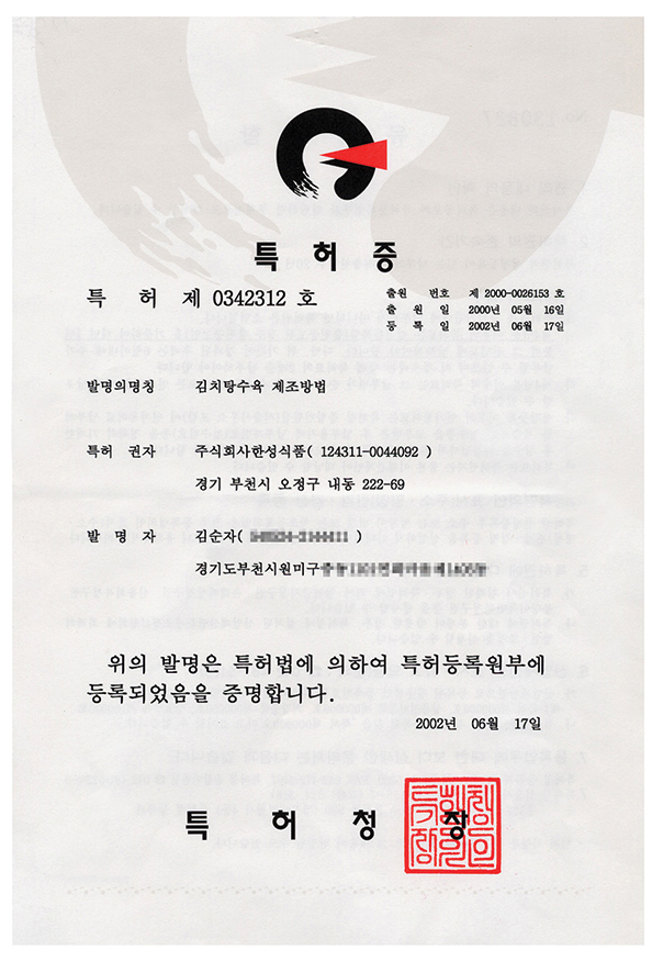 | 13 | 2004. 06. 25 | 0439152 | 분말김치 제조방법 |
