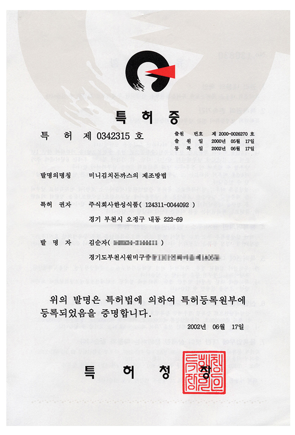 | 7 | 2002. 06. 17 | 0342315 | 미니김치돈까스 제조방법 |