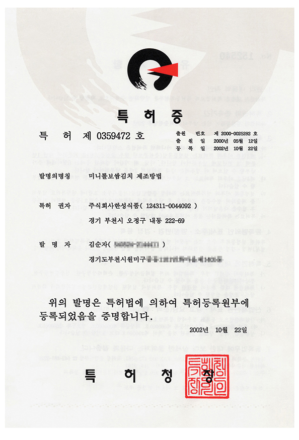 | 9 | 2002. 10. 22 | 0359472 | 미니롤보쌈김치 제조방법 |