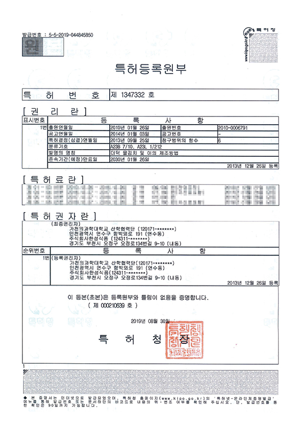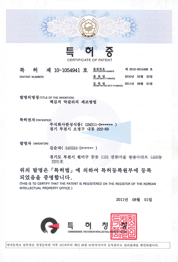 | 19 | 2011. 08. 01 | 10-1054941 | 백김치 막걸리 제조방법 |